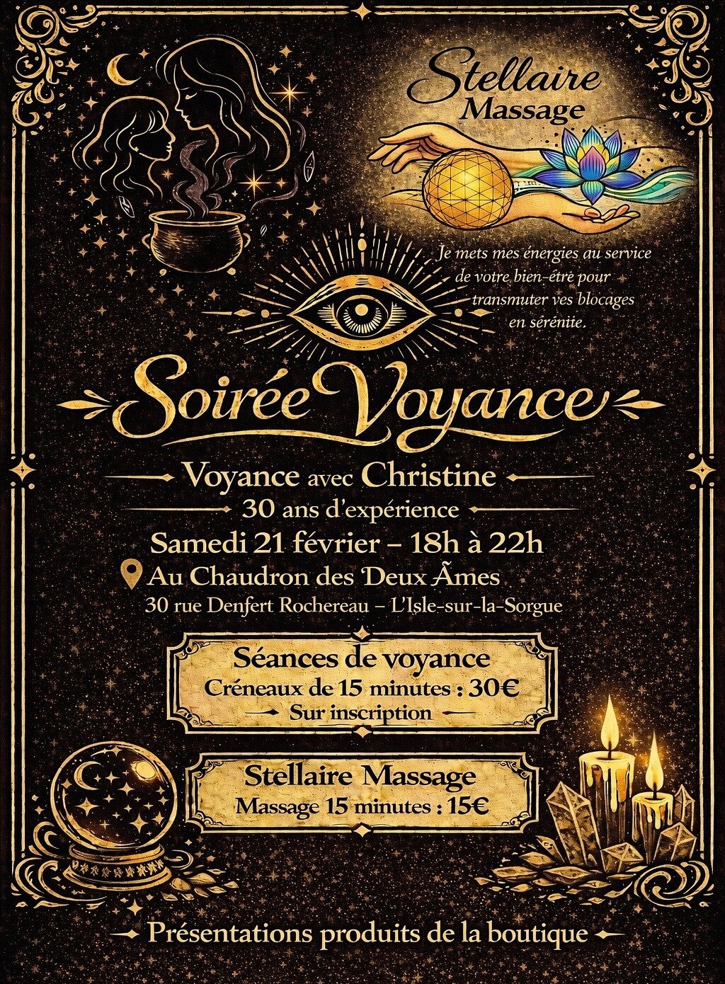 Au chaudron des deux âmes et stellaire massage vous proposent une soirée voyance à la boutique le 21 Février de 18h à 22h.